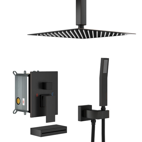 Shower System With Waterfall Tub Spout And 12" Ceiling Mount Square Shower Head - Oil-Rubbed Bronze