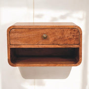 - Curve Upper Slot Floating Bedside - The bigger brother to our original Floating Curve Open Slot Bedside, this minimalistic wall-mounted unit has been constructed from 100% solid mango wood in a finish and features 1 drawer with a shiny knob along with 1 open shelf for storing any bits and pieces you wish to keep close by before bedtime. It's neat and clean design can easily be mounted on the wall without the fuss of any legs. Caution! Do not sit on the unit.