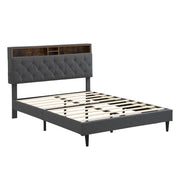 Modern Queen Size Upholstered Platform Bed Frame With Button Tufted Linen Headboard And USB Ports - Dark Gray