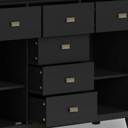 • Features six (6) central drawers with metal glides, and two (2) side doors with tempered glass that open to large storage spaces with one (1) shelf each.