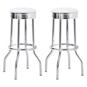 - Padded round seat upholstered in soft, easy-to-clean white leatherette combines comfort with durable, long-lasting construction