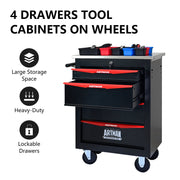 4 Drawer Multifunctional Tool Cart With Wheels, Metal Rolling Tool Cart Storage For Garage Workshop Warehouse Repair Shop With Stainless Steel Roof - Black / Red