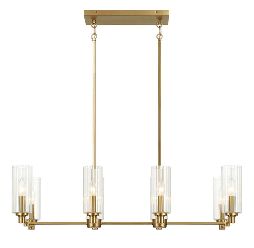 View full detailsElegance and Warmth: The Willow Eight Lights Island combines clear ribbed glass with a satin brass finish, infusing any room with elegance an...