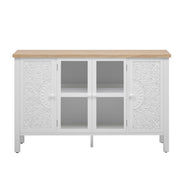 - Ample Storage Space: Including three spacious cabinets, the middle cabinet features a glass door that clearly displays the items inside. The cabinet doors on both sides are symmetrically carved with patterns, and each cabinet contains an adjustable shelf.