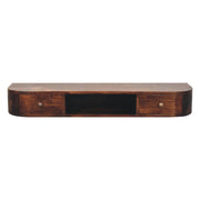- Artisan Furniture Solid Wood Lunar 2 Drawer Floating Console - This wall-mounted console has been constructed from 100% solid mango wood in a chestnut finish and offers a unique shaped design with rounded edges. It can be easily mounted on the wall without the fuss of legs. It also features an open slot and 2 drawers perfect for storing any bits and pieces and keeping them close before bedtime.