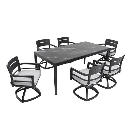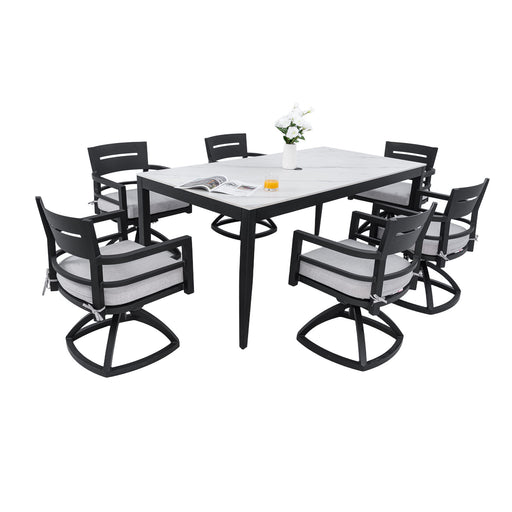 View full detailsDining Set:Includes a rectangular table with a marble-inspired sintered stone top and 6 swivel rockers. Tabletop: Crafted from high-quality sinter...