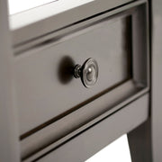 - Transitional design includes tapered legs, molded crown edged table top, panel framed drawer fronts and antique round decorative knobs
