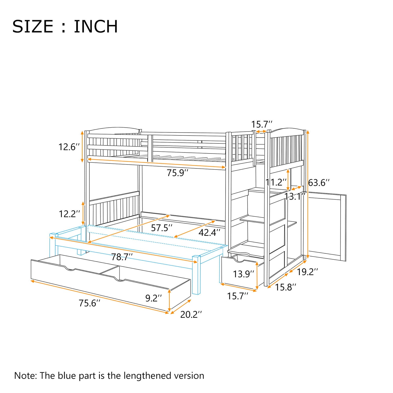 Twin Over Full / Twin Bunk Bed, Convertible Bottom Bed, Storage Shelves And Drawers - Gray