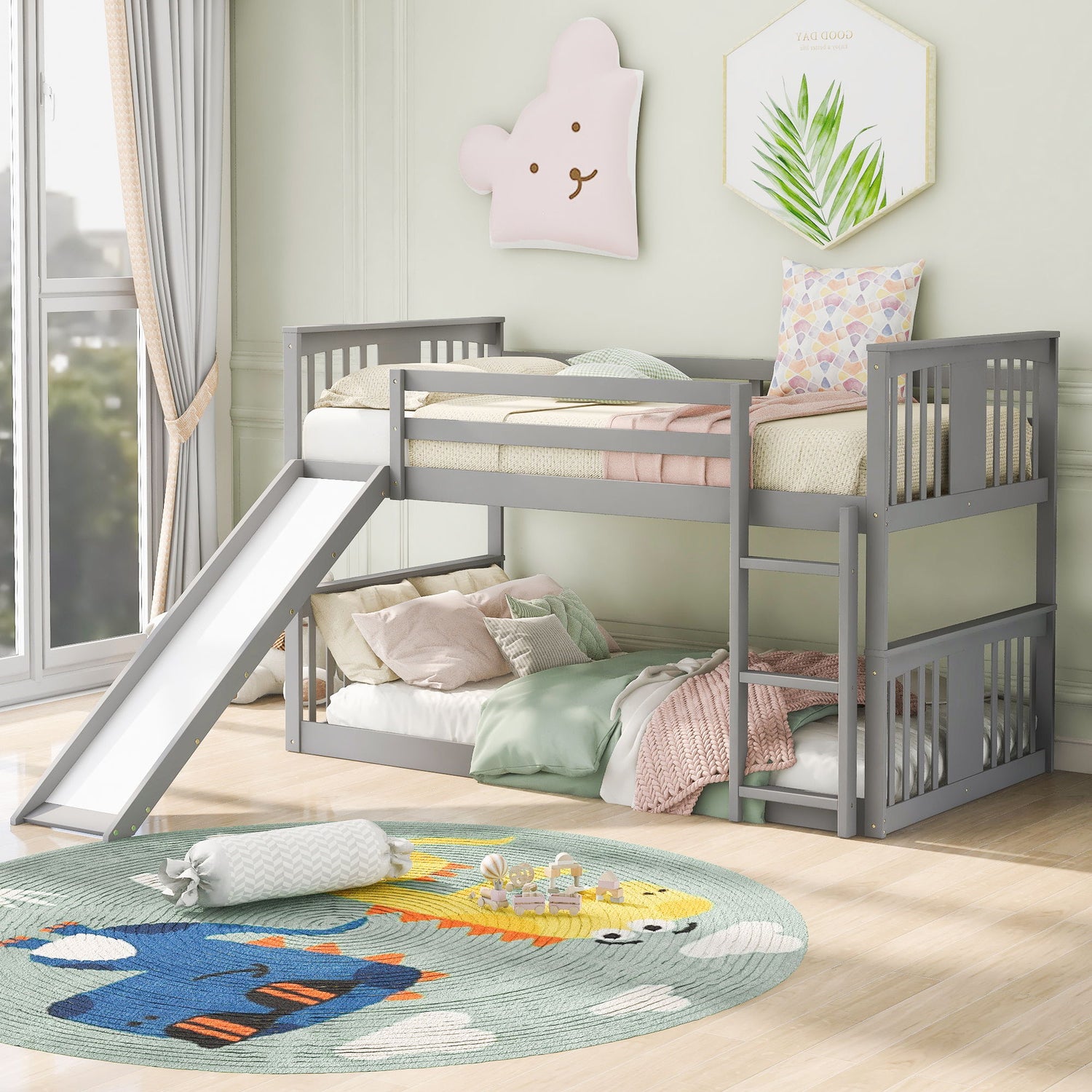 Convertible Ladder and Slide: With a built-in ladder, it is easy to climb up and down from the top bed. Featuring a low slide for added fun, this bunk bed helps develop balance and coordination. The slide and ladder are convertible, allowing placement on either the left or right side. Additionally, the bottom guardrails and bottom bed can be removed for three different assembly methods.