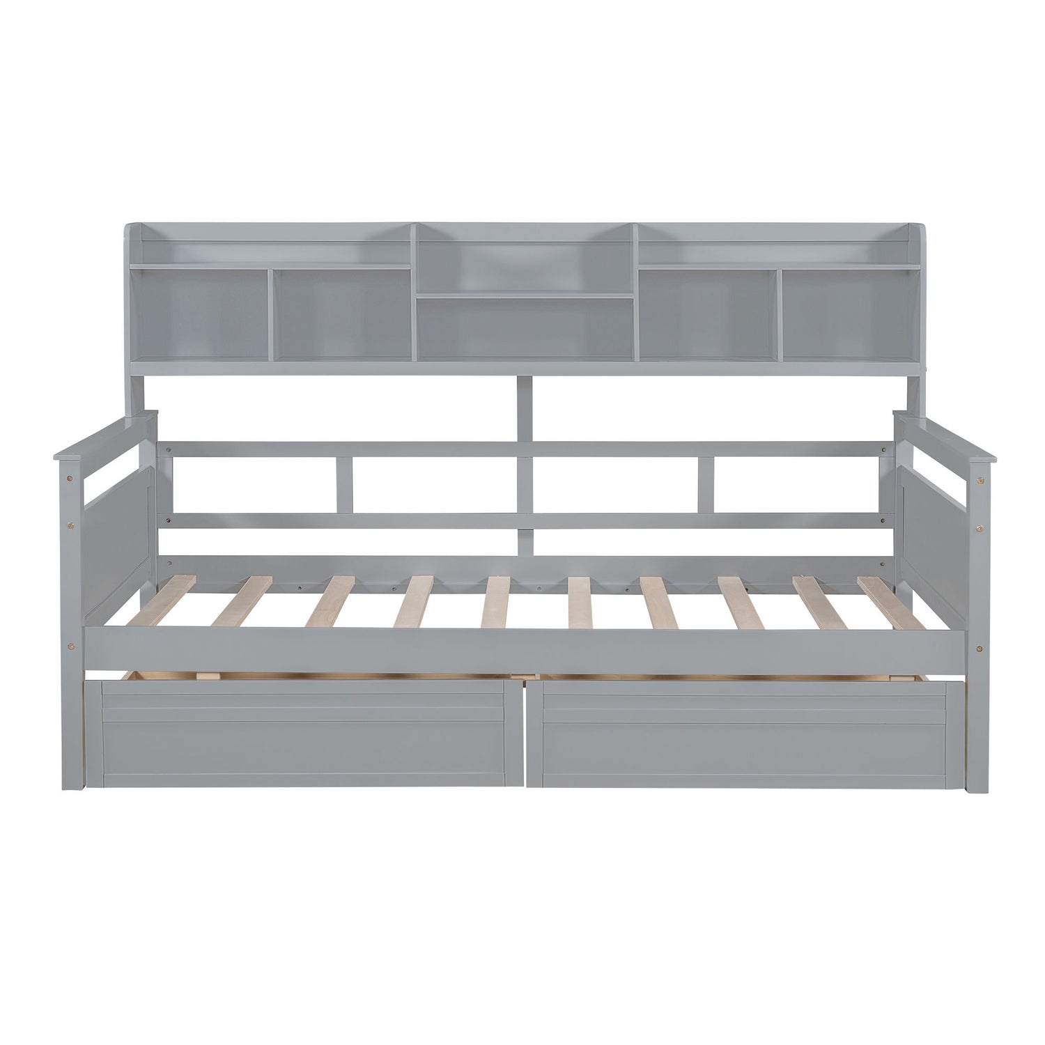 Twin Size Daybed, Slat Support, With Bedside Shelves And 2 Drawers - Gray
