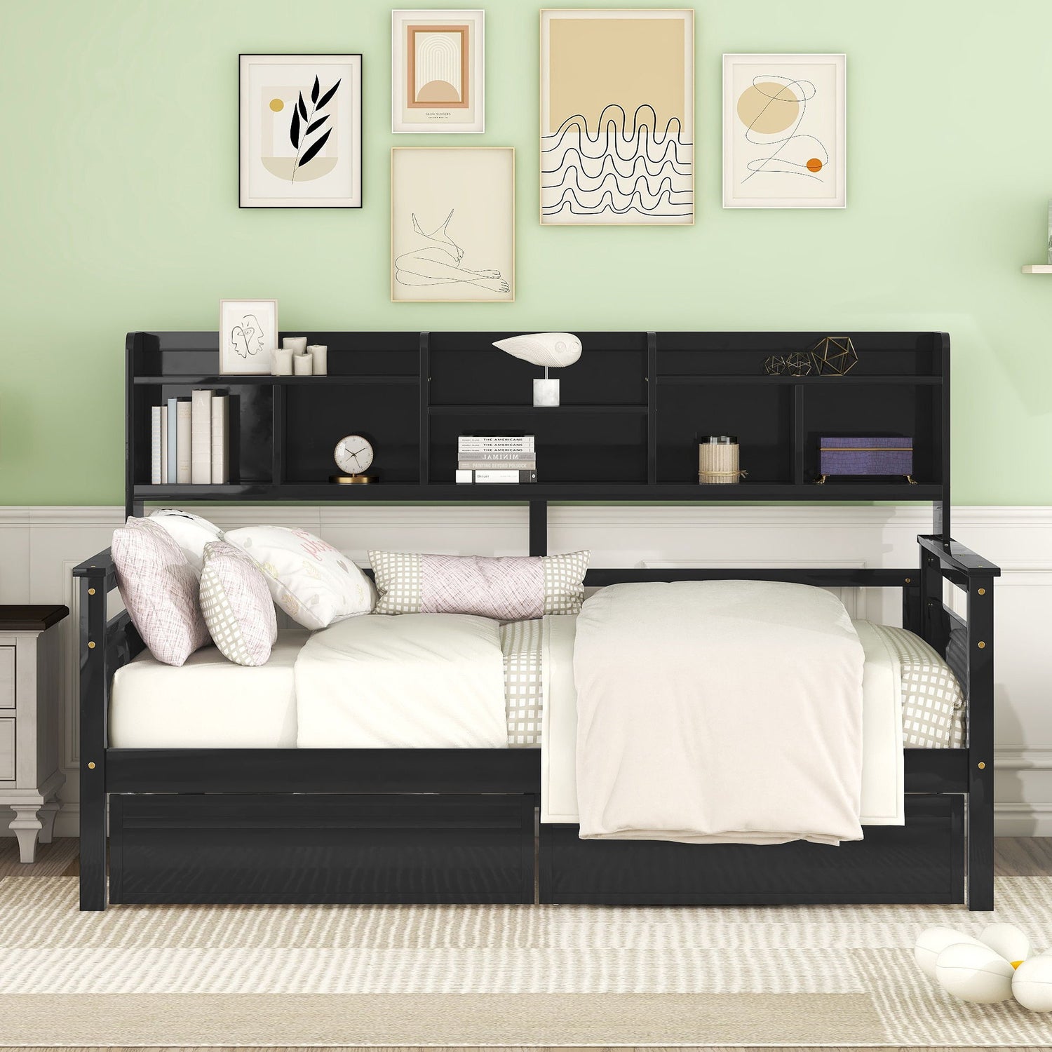 Twin Size Daybed, Slat Support, With Bedside Shelves And Two Drawers - Espresso