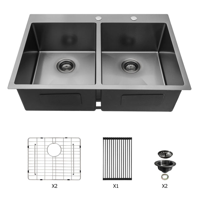 Double Bowl Drop In Kitchen Sink 33" X 22" With 16 Gauge Stainless Steel And 2 10" Deep Basins - Gunmetal Black
