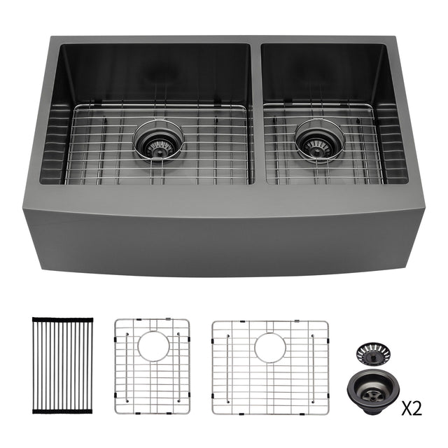 Double Bowl Farmhouse Sink, Stainless Steel Apron Front 16 Gauge - Gunmetal Black