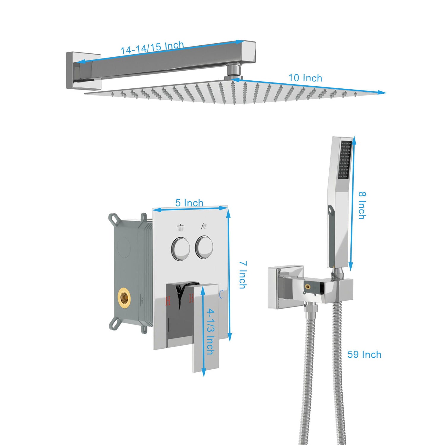 - Included Components: Comes with a 10 inch square rain shower head, shower arm, handheld shower, 59" hose, and installation parts.