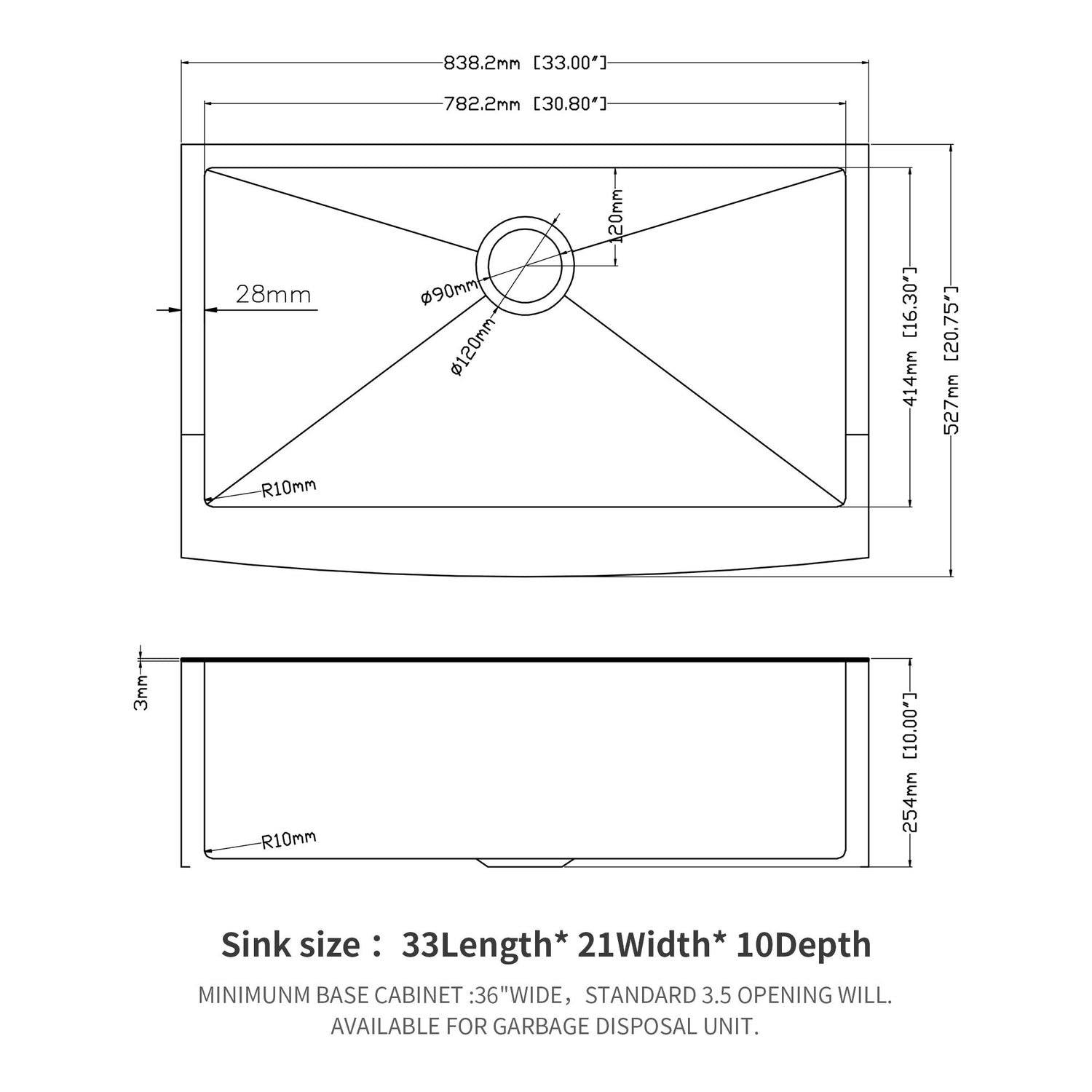 Farmhouse Kitchen Sink 33" Stainless Steel 16 Gauge Apron Front - Gold