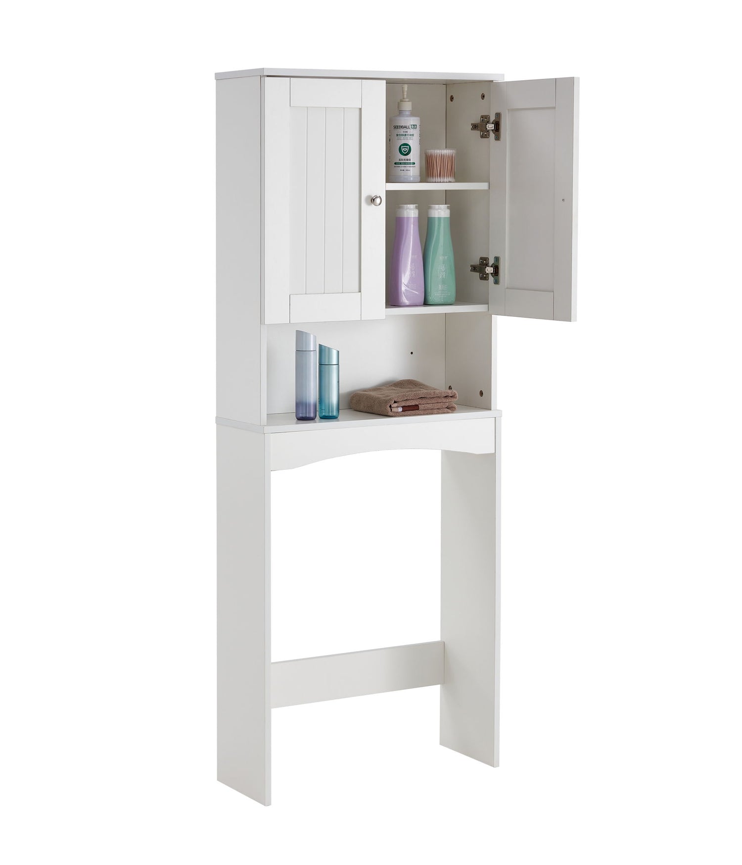 - Stylish Bathroom SpaceSaver: A sleek matte white storage cabinet organizer that fits over the toilet.
