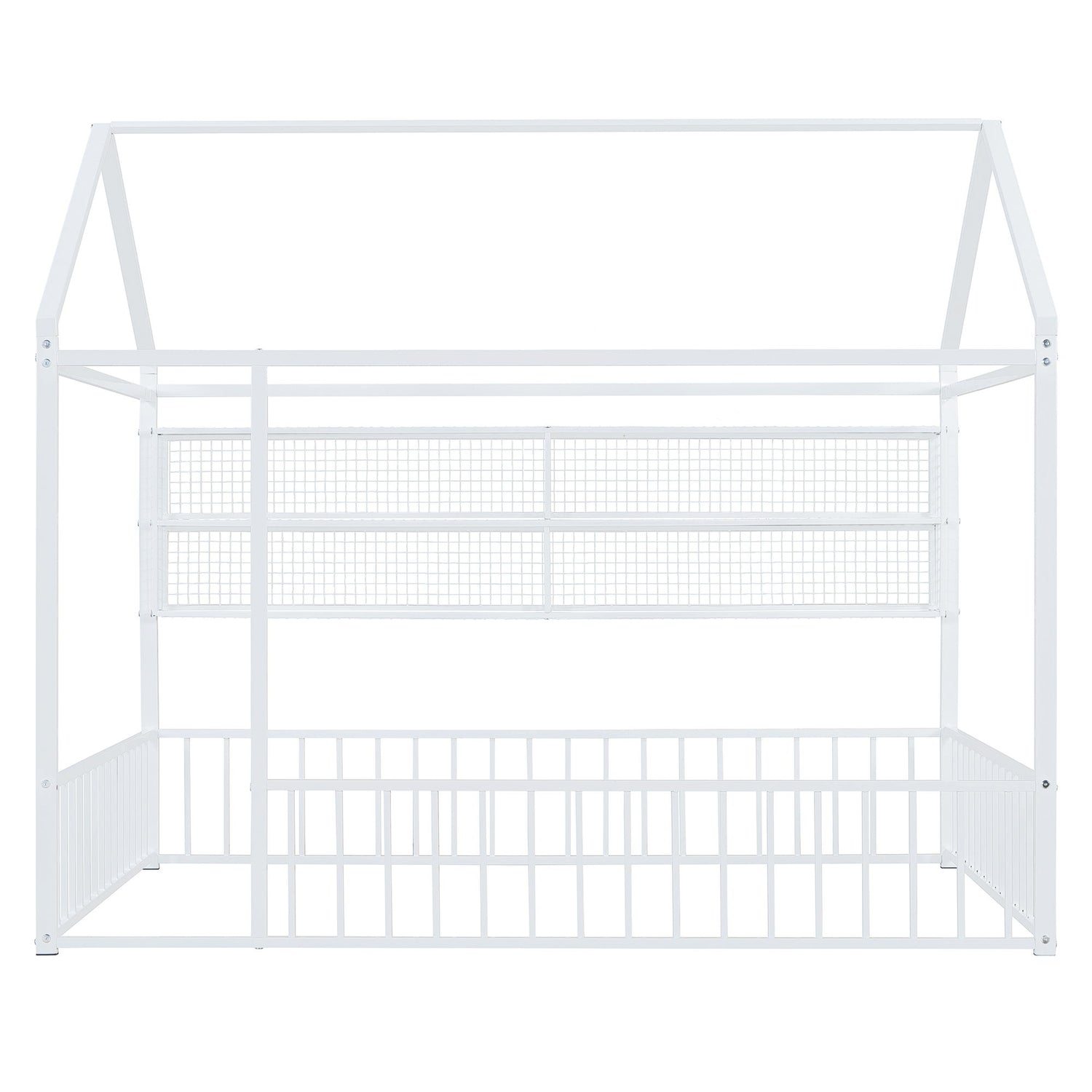 This stylish metal bed frame features a unique house-shaped design, adding a playful yet modern touch to any bedroom. With sturdy metal construction, it ensures long-lasting durability and a secure night's sleep. The back of the bed is equipped with four convenient metal grid shelves, providing extra storage for your essentials while maximizing space. This bed frame blends functionality with a whimsical design, making it a standout piece in any room.