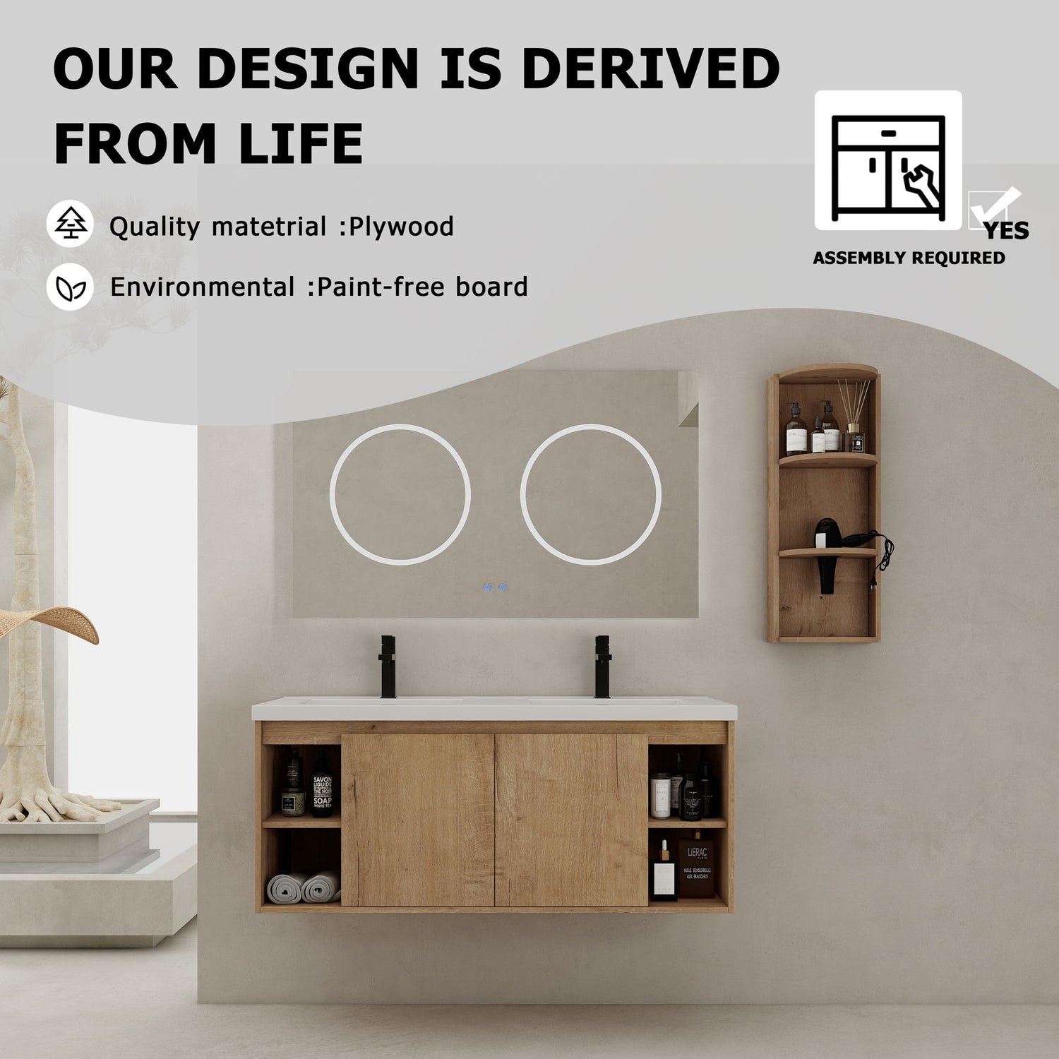 Modern 48" Wall Mounted Bathroom Vanity With Double Resin Sink And Storage Rack Soft Close Doors - Imitative Oak