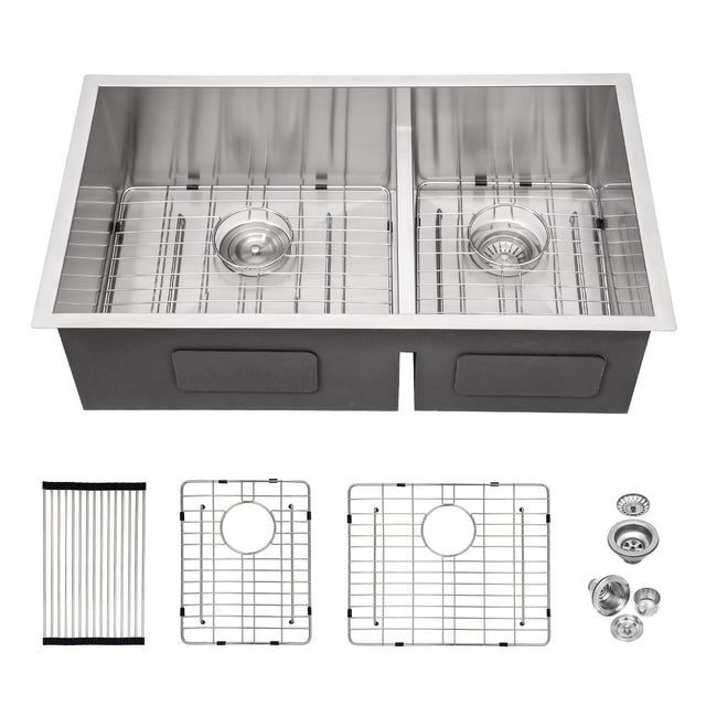 Double Bowl 33" Undermount Kitchen Sink 60 / 40 Design Stainless Steel 16 Gauge With Deep Basins - Black
