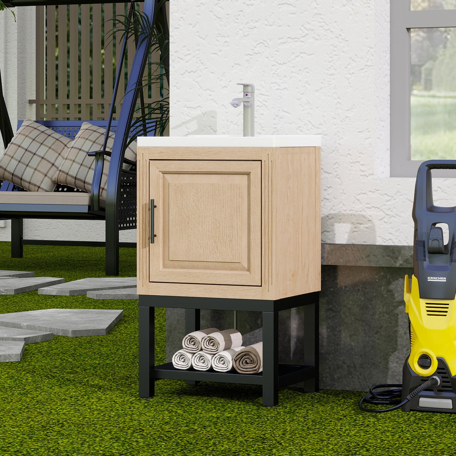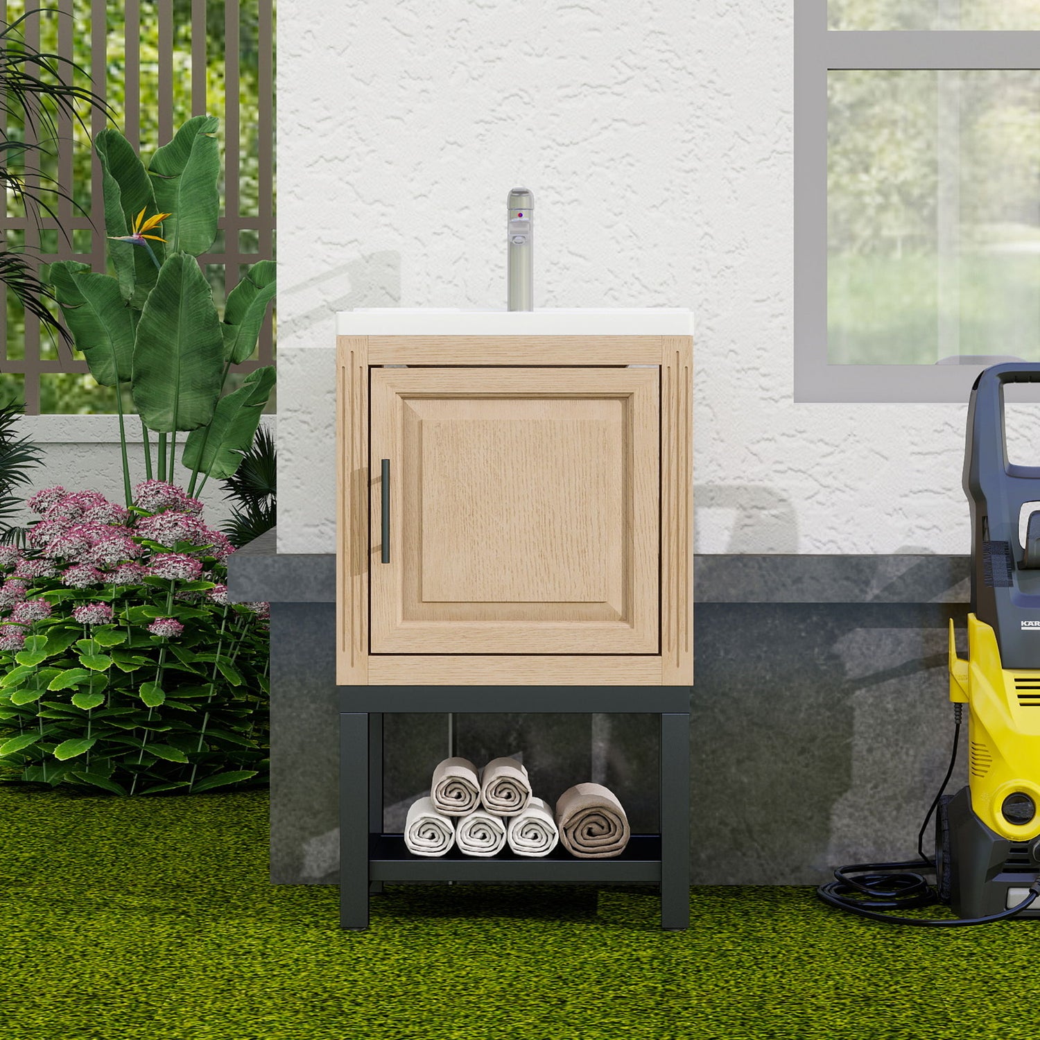Modern Freestanding Bathroom Vanity With Ceramic Sink, Hot And Cold Faucet, 1 Door Cabinet & Open Iron Shelf, Magnesium Oxide And Iron Frame - Natural