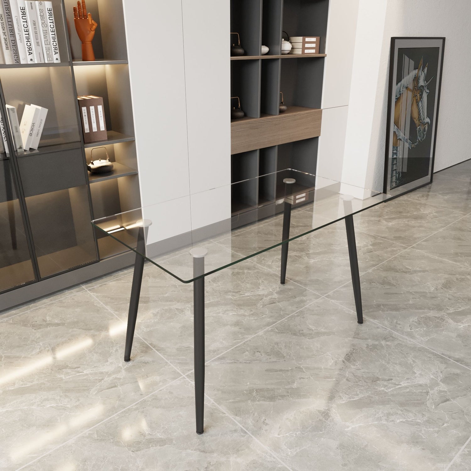 - Glass Dining Table: Sleek design with black metal legs for style and stability.