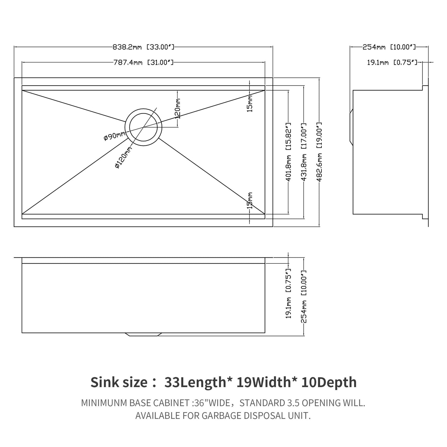 - Dimensions: Exterior 33" x 19" x 10", fits most 36" cabinets, with a standard 3-1/2" drain opening.