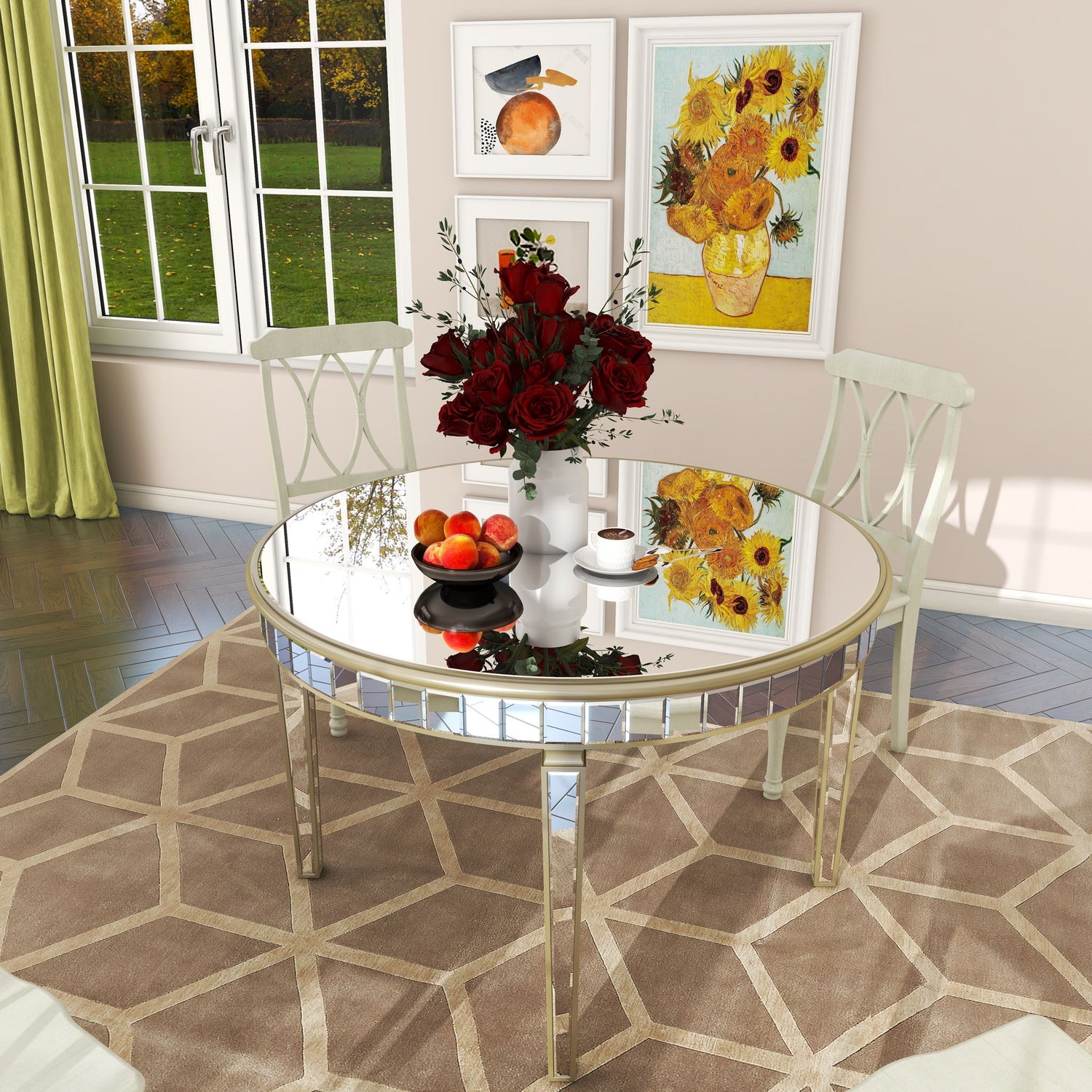 - Vintage Design: The round dining table features a mirrored top and tapered legs with a gold geometric frame for a special look.