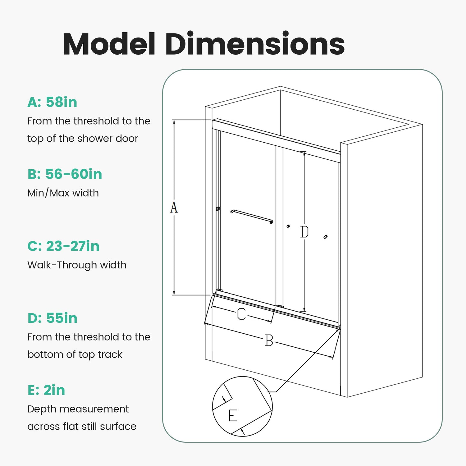 56" -60" W*58" H Semi-Frameless Double Sliding Tub Door, Bypass Bathtub Shower, 1 / 4" (6Mm) Thick SGCC Tempered Glass Door - Chrome