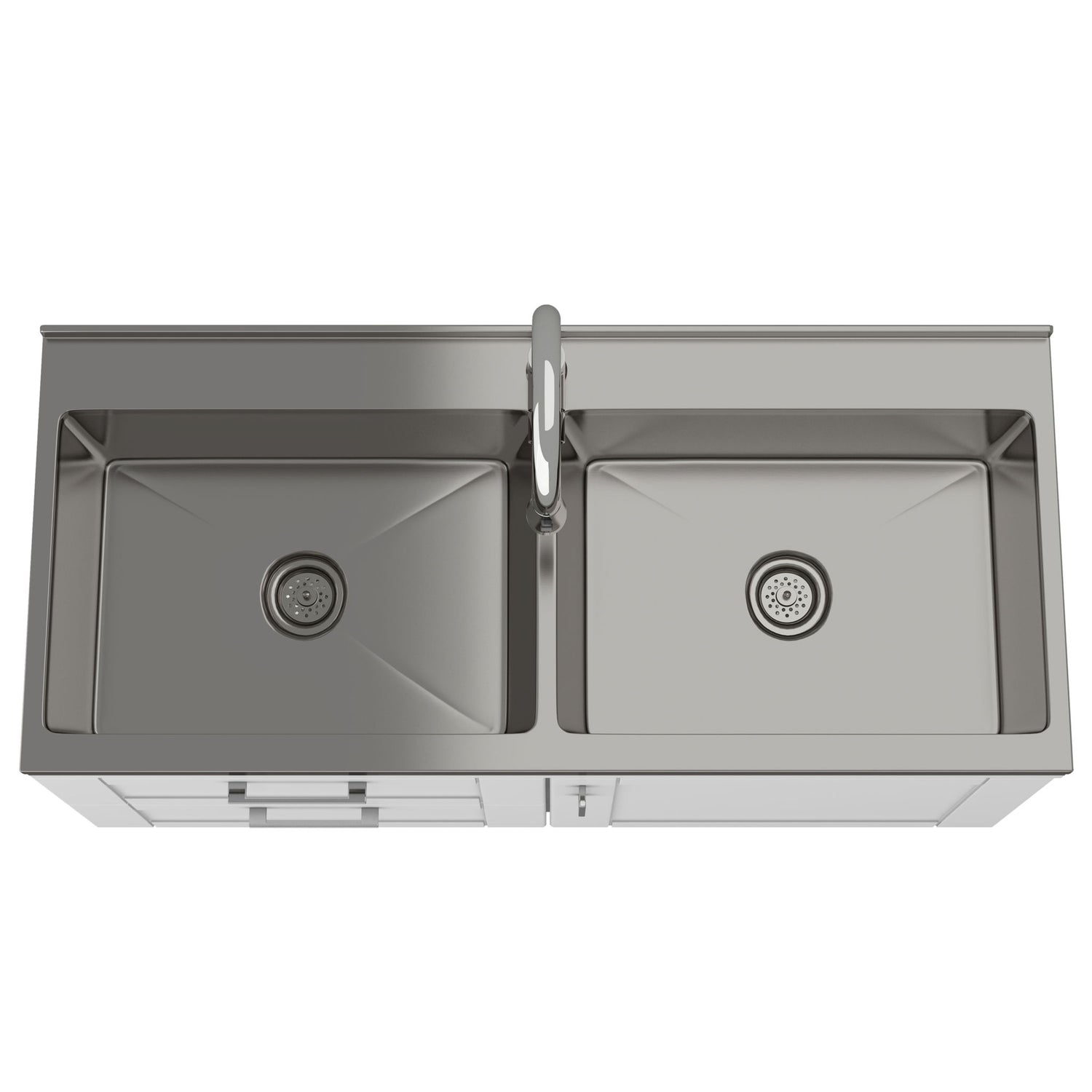 - Features one 1 large functional bottom drawer and side door with contemporary hardware that opens to plenty of storage, Deep 20 gauge welded double stainless steel sink with back splash