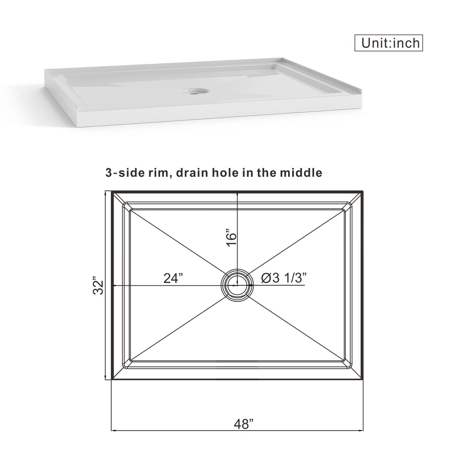 - Dimension: Measures 48L x 32W x 3.5''H with a center drain diameter of 3.5"