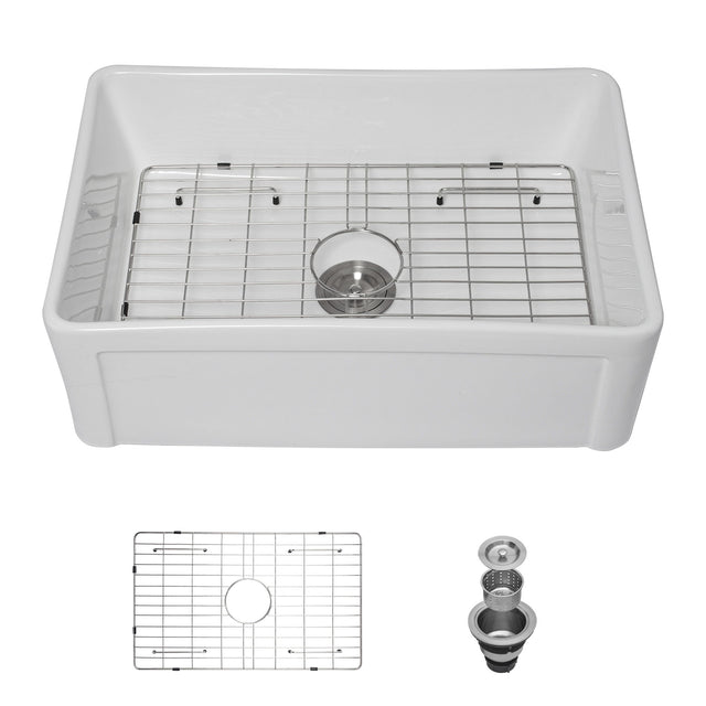 Sink 30" Apron Front Reversible Single Bowl Kitchen Sink & Grid And Strainer - White