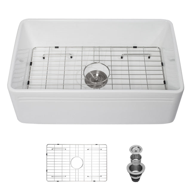 Sink 30" Apron Front Reversible Single Bowl Kitchen Sink With Grid And Strainer - White