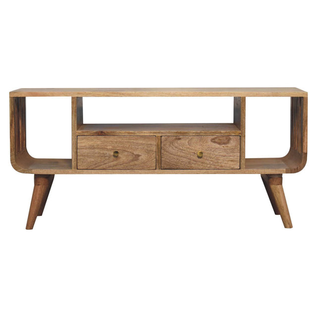 - Soba Nordic Multi Media Unit - This Soba Media Unit has been constructed from 100% solid mango wood and has a lovely natural oak-ish finish. It features a unique ridged design on either side of the piece, t-bar handles, as well as 4 Nordic style legs for stability and a modern touch. Make full use of this piece in your living room or hallway and let it take care of storing all your belongings.