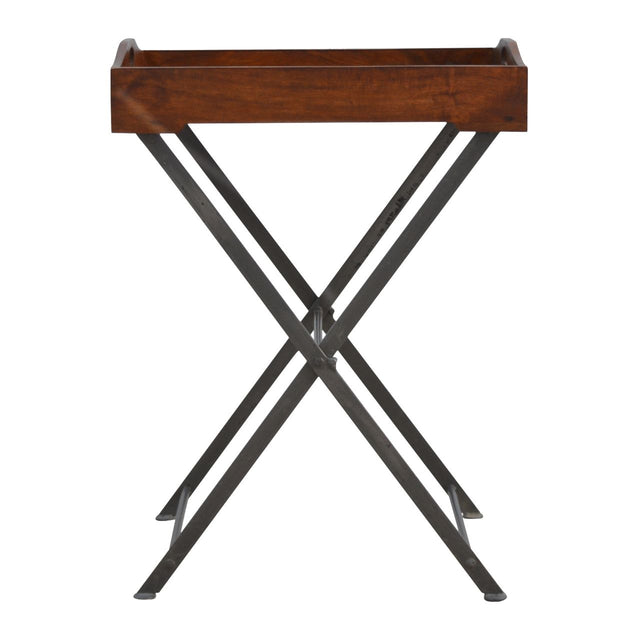 - Wood Tray With Cross Iron Base - Add this wooden tray to your kitchen collection, it has the perfect work top for storing ny fruits or vegetables and provides ample space for chopping and cutting up food. It features iron based legs which can be folded and stored away for practicality.